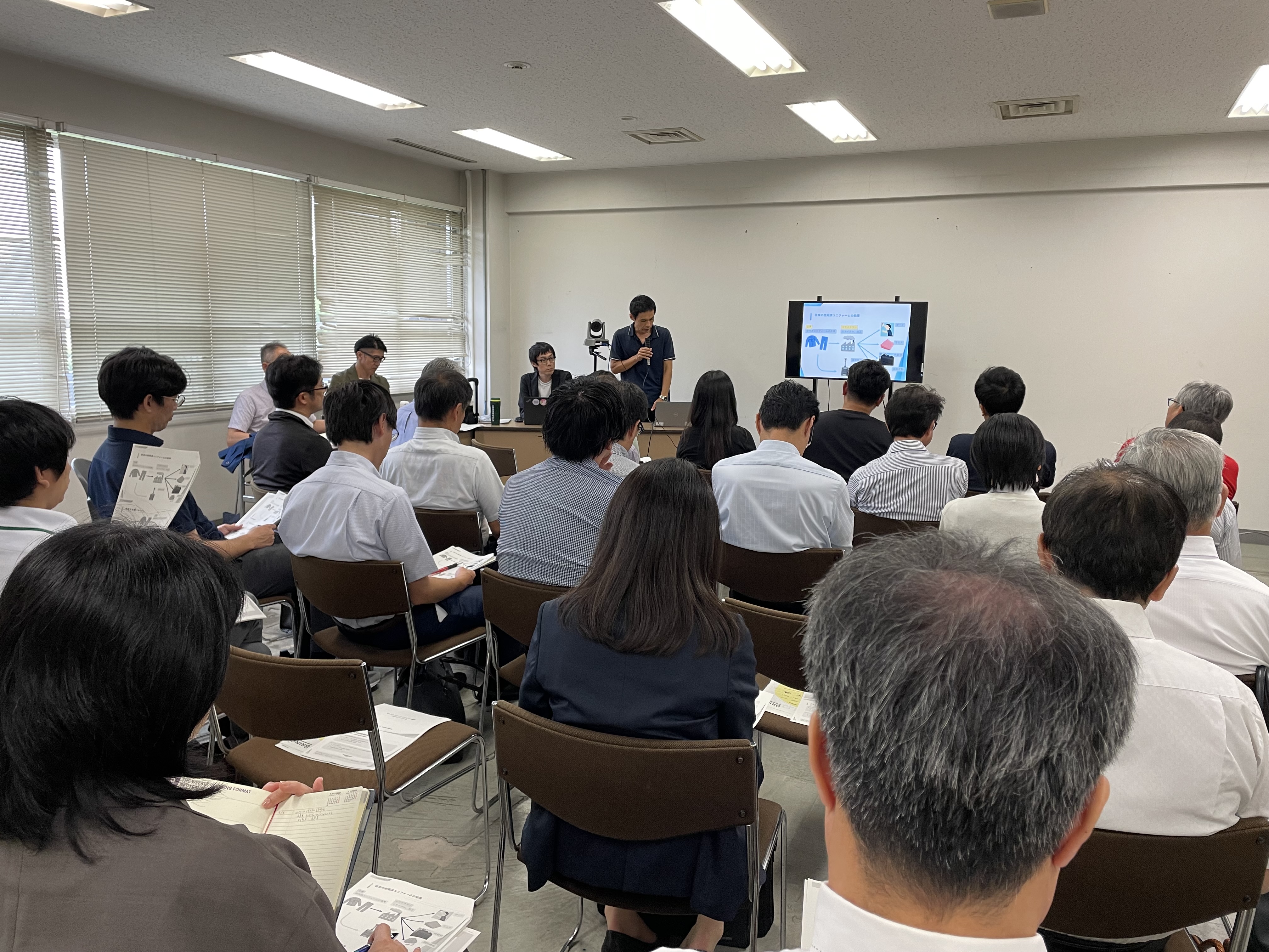 その取組の一環として、企業のユニフォーム(制服や作業服など)の水平リサイクルの推進のため、衣類のケミカルリサイクルに取り組む事業者を講師に招き、普段ユニフォームを使用する事業者向けに、回収・リサイクルに関する説明会を実施しました(令和6年9月3日開催)。