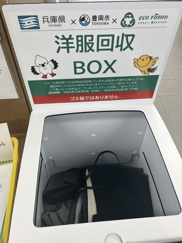 サステナブルファッションの展開として、兵庫県では効率的・効果的な衣類回収方法を検討するため、豊岡市と株式会社ワールドと連携し、衣類回収実証事業「エコロモキャンペーンin豊岡」を実施しました(令和7年12月1日~令和8年3月2日)。