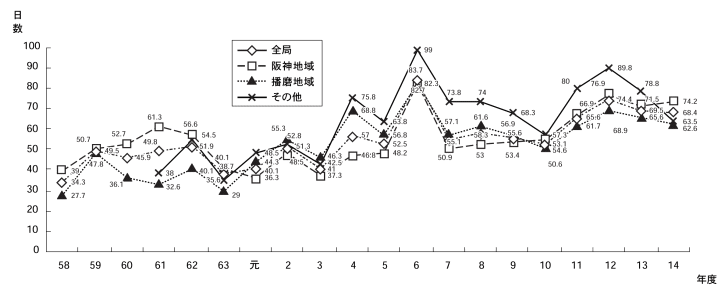 また、昼間の1時間値の最高値は加古川市尾上の0.164ppmである。昼間の濃度が0.06ppmを超えた日数の平均(測定局ごとの超過日数の合計を測定局数で割ったもの)は68日であり、前年度と比較して2日減少した。