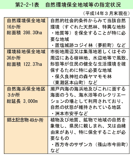 県下の貴重な自然環境や身近で大切な自然環境を保全し、次世代に引き継ぐため、「環境の保全と創造に関する条例」に基づき、自然環境保全地域、環境緑地保全地域、自然海浜保全地区及び郷土記念物を指定し、指定地域等の中で行う一定の行為については、許可又は届出を要することとして保全を図っている。現在の県下の指定状況は、第2-2-1表のとおりである。