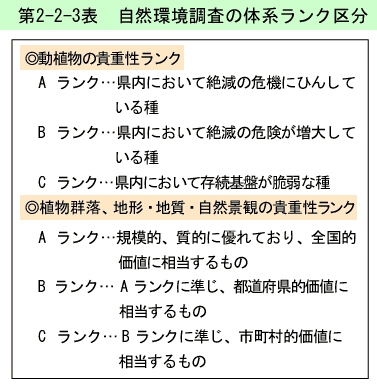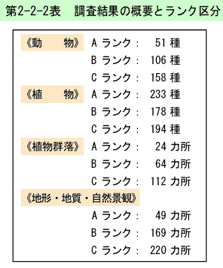 県下の動物、植物、植物群落、地形・地質・自然景観を対象に選定し、貴重性の高いものからA、B、Cのランク付けを行い評価をした。調査結果の概要とランク区分は第2-2-2表のとおりである。