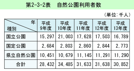 国立公園、国定公園及び県立自然公園の利用者数は、平成13年は約3,085万人であった。(第2-3-2表)。