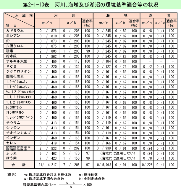 第2-1-10表 河川、海域及び湖沼の環境基準適合等の状況