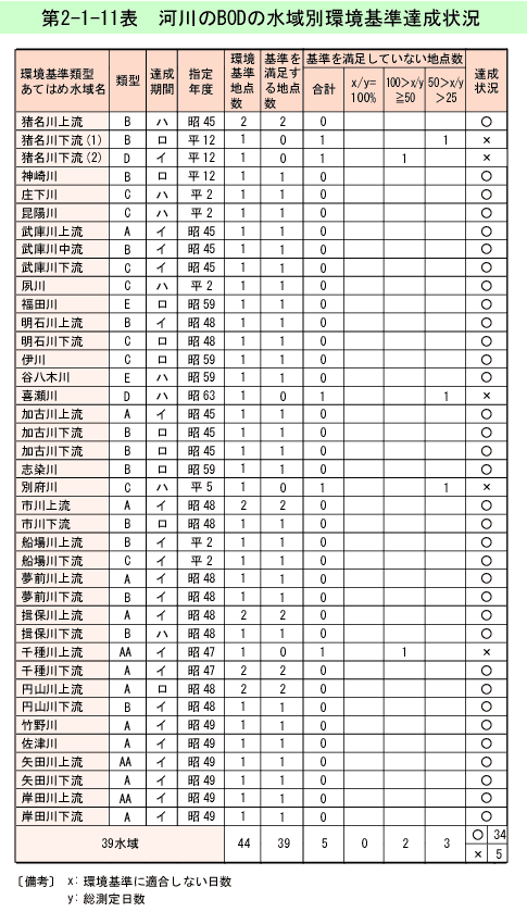 有機汚濁の代表的指標であるBODについて、河川での水域別環境基準達成状況は第2-1-10表のとおりである。39水域中34水域(87%)で環境基準を達成している。