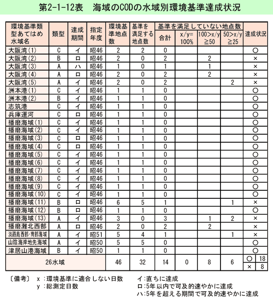 環境基準達成水域数は18水域である。未達成の8水域は大阪湾4水域、播磨灘及び播磨灘北西部3水域、淡路島西部・南部1水域である。
