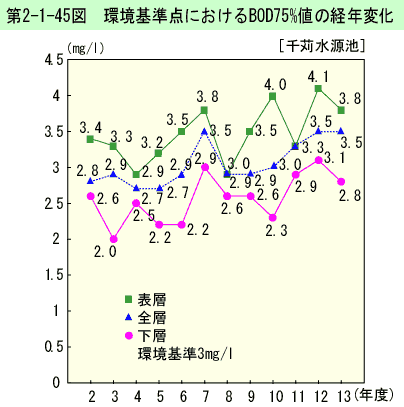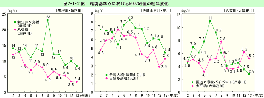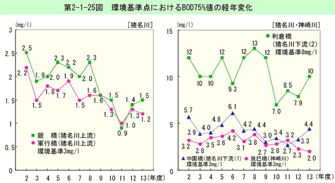 環境基準点におけるBOD75%値の経年変化は、第2-1-25図のとおりである(生活環境項目の環境基準適合状況は資料編第5-1表参照)。