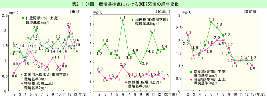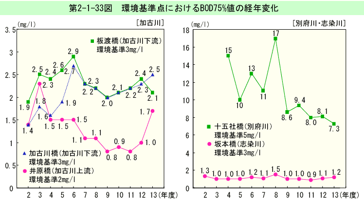 環境基準点におけるBOD75%値の経年変化は、第2-1-33図のとおりである(生活環境項目の損境基準適合状況は、資料編第5-9表参照)。