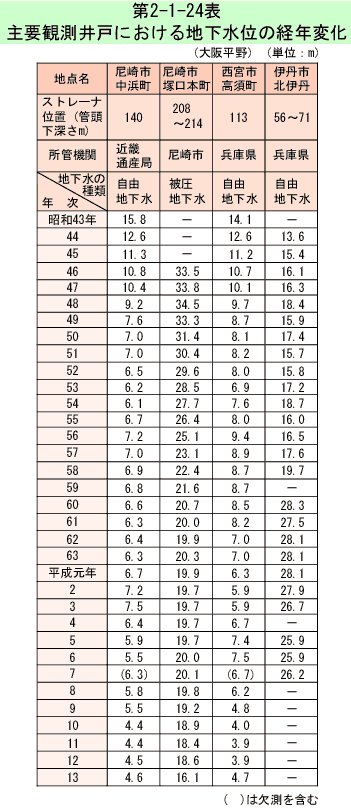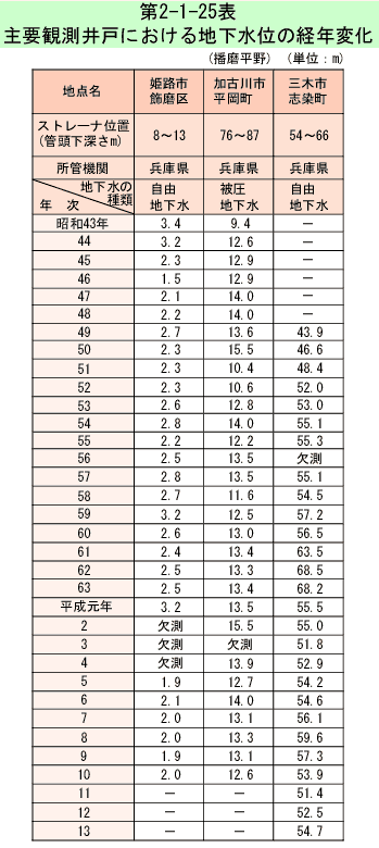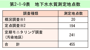 地下水質については、平成元年6月の「水質汚濁防止法」の一部改正に伴って、平成元年度から地下水の水質の測定に関する計画を定め地下水の常時監視を行っている。地下水質測定計画に基づく測定地点数は、第2-1-9表のとおりである。