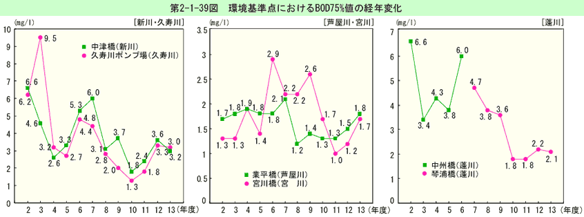 主要測定点におけるBOD75%値の経年変化は、第2-1-39図のとおりである(生活環境項目の測定結果は資料編第5-15表参照)。