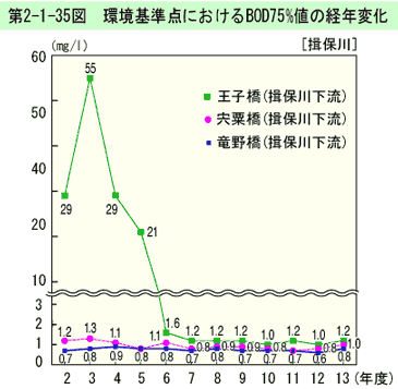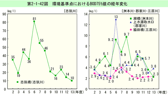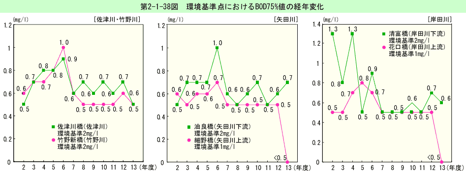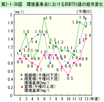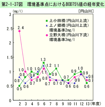 環境基準点におけるBOD75%値の経年変化は、第2-1-37図のとおりである(生活環境項目の環境基準適合状況は、資料編第5-13表参照)。