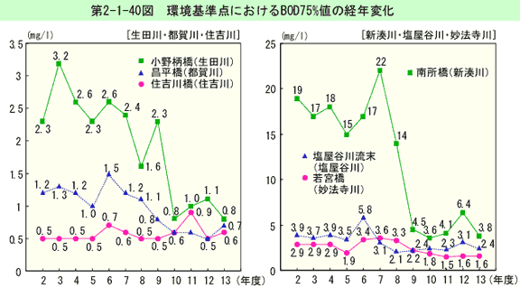環境基準点におけるBOD75%値の経年変化は第2-1-38図のとおりである(生活環境項目の環境基準適合状況は資料編第5-14表参照)。