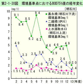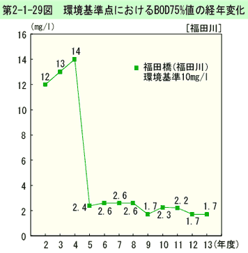 環境基準点におけるBOD75%値の経年変化は、第2-1-29図のとおりである(生活環境項目の環境基準適合状況は、資料編第5-5表参照)。