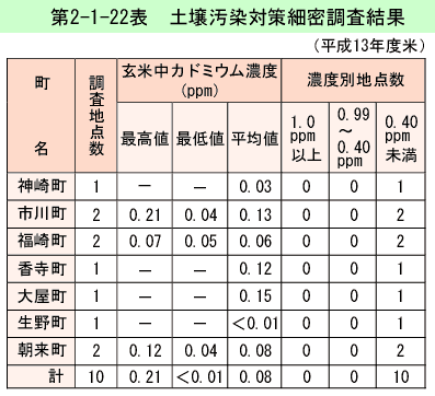 河川、海域などの公共用水域の水質汚濁の現況は、人の健康の保護に関する項目(以下「健康項目」という)については、26項目のうち、砒素、ふっ素及びほう素を除く23項目では、すべての測定点において環境基準を達成している。砒素については、生田川小野柄橋で環境基準を超過していたが、これは、砒素を含んだ湧水の影響によるものである。ふっ素については5地点で、ほう素については1地点で、環境基準を超過している。
