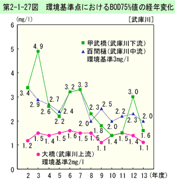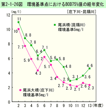 環境基準点におけるBOD75%値の経年変化は、第2-1-26図のとおりである(生活環境項目の環境基準適合状況は資料編第5-2表参照)。