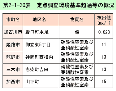 概況調査では、硝酸性窒素及び亜硝酸性窒素が1地点で環境基準を超過し、定点調査では、鉛が1地点、硝酸性窒素及び亜硝酸性窒素が3地点で、