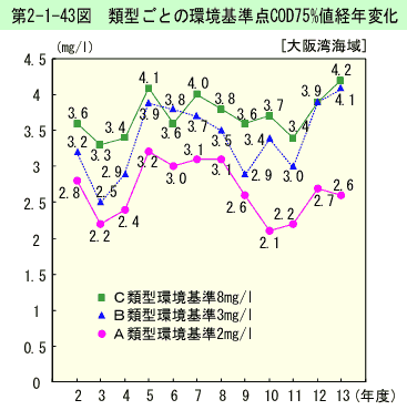 類型ごとの、環境基準点でのCOD75%値の平均濃度の経年変化は、第2-1-44図のとおりである。(生活環境項目の環境基準適合状況は、資料編第5-21表参照)。