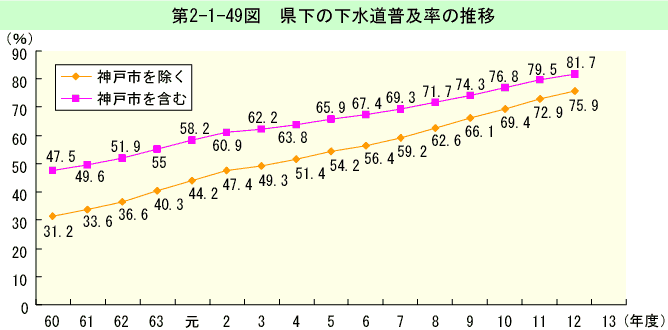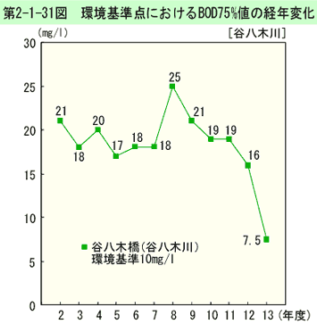 環境基準点におけるBOD75%値の経年変化は、第2-1-31図のとおりである(生活環境項目の環境基準適合状況は、資料編第5-7表参照)。