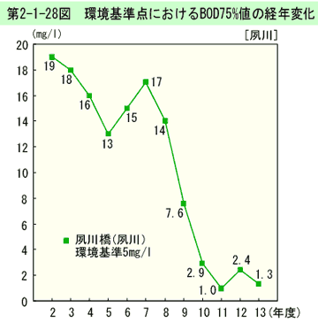 環境基準点におけるBOD75%値の経年変化は、第2-1-28図のとおりである(生活環境項目の環境基準適合状況は資料編第5-4表参照)。