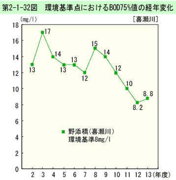 環境基準点におけるBOD75%値の経年変化は、第2-1-32図のとおりである(生活環境項目の環境基準適合状況は資料編第5-8表参照)。