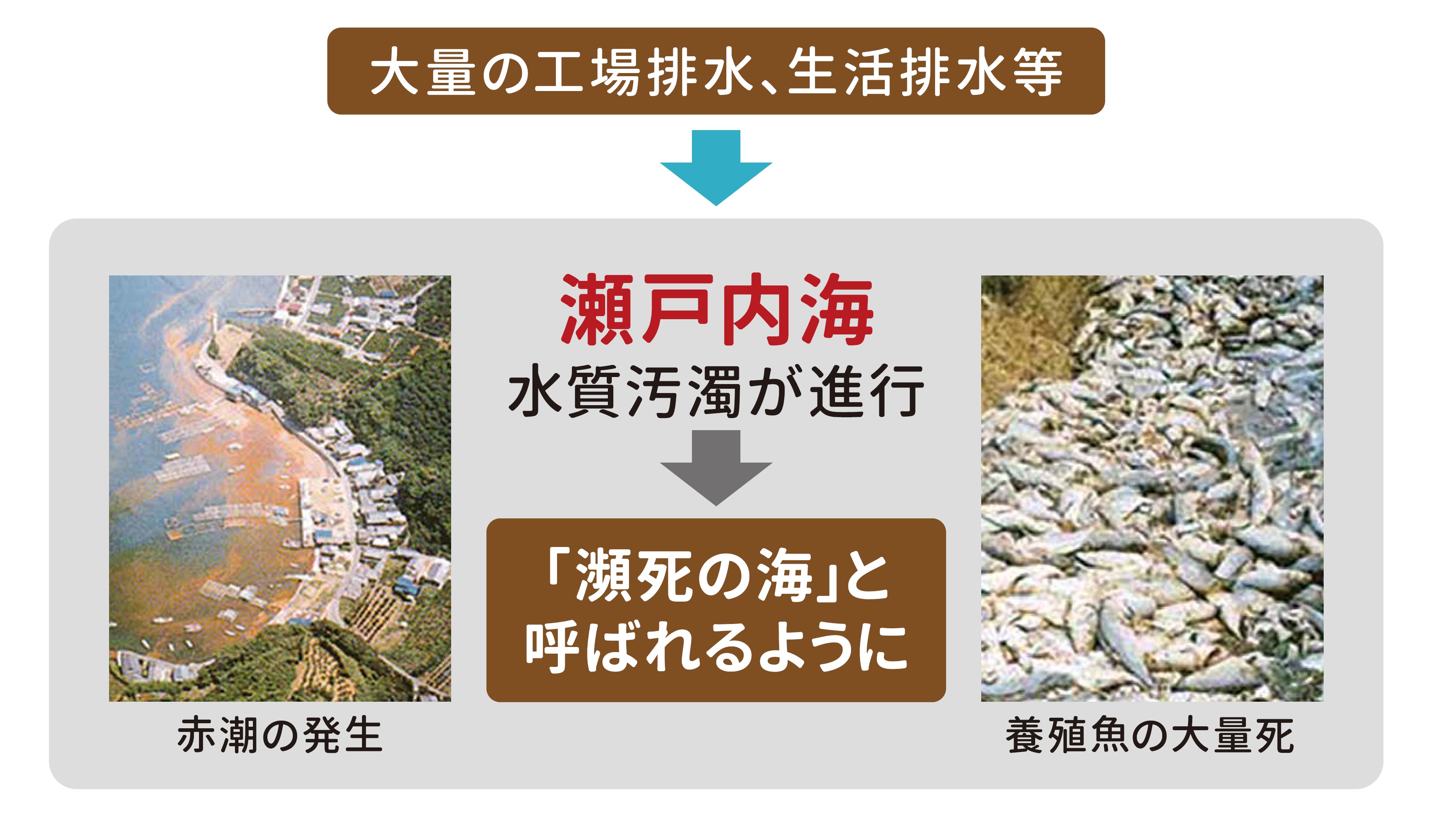 その結果、プランクトンが大量に発生し、赤潮などにより、漁業・養殖業が大きな被害を受け、瀬戸内海は「瀕死の海」といわれました。